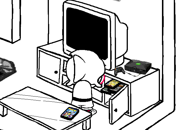 The TV is off. Next to it is your XBOX, which you recently used to play SPONGEBOB SQUAREPANTS: BATTLE FOR BIKINI BOTTOM, HALO: COMBAT EVOLVED and TONY HAWK’S UNDERGROUND.