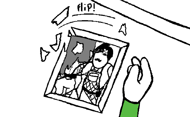 It seems the visage of your DAD has been unfortunately torn off the picture in the fracas of your fumble, but YOUR NEIGHBOR has survived unscathed. He is his closest friend and workplace confidant, and have known each other for as long as you can remember. They are always working on some kind of project together, be it some kind of hands-on creative endeavour, or some shady machinations and plots. Oh, how they love their plots.
