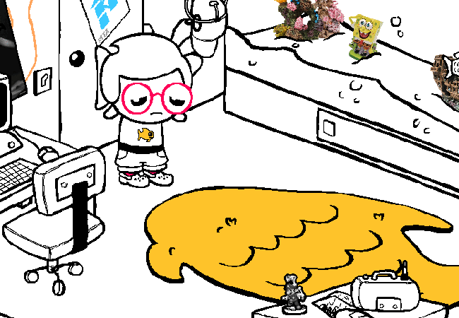 You attempt to skitter under your made-to-order GOLDFISH RUG so that you might avoid the shame of a failed purchase, only to bump into a forgotten artifact…
