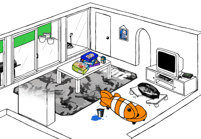 Returning back to the LIVING ROOM, you sneak behind your COUCH.