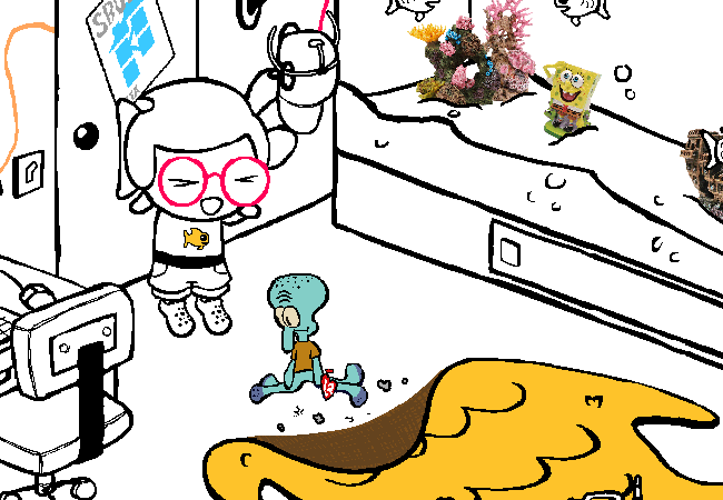 Ah! It’s your old plush doll! LITTLE SQUIDWARD! Once a favourite playtime partner in your youth, he’s seen far better days.