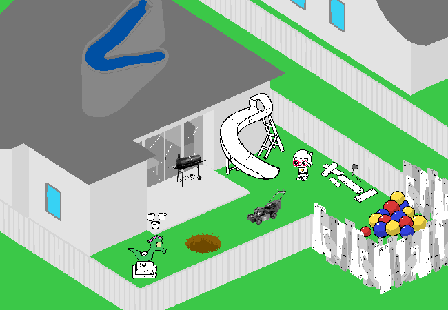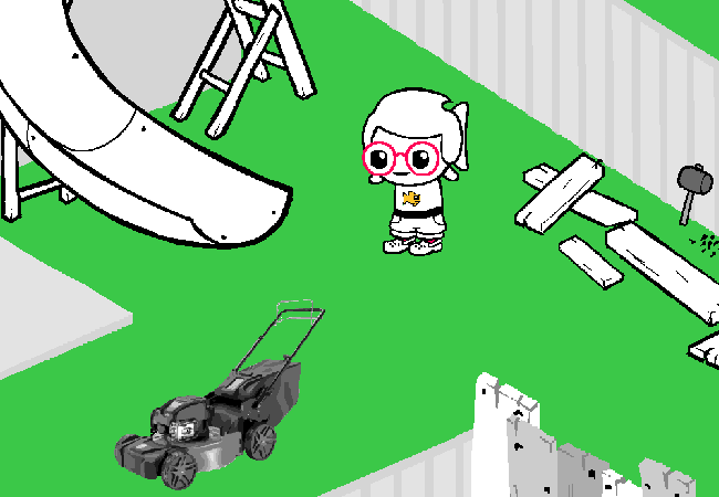 With a hop and a flip, you return to your domicile. Looking over your BACKYARD, you can see it's totally littered with the residue of your DAD's attempts at HOME IMPROVEMENT. Various materials are scattered all over the place between the effigies of his creations.